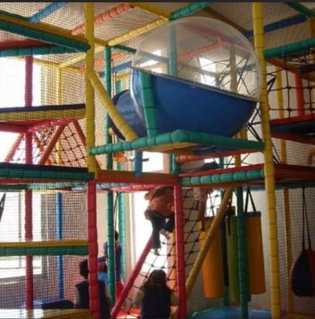 Jardín con juegos infantiles, tombling, lago y asadores., Ludoteca.