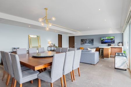 El departamento tiene 278 m² cubiertos, con pisos de mármol Santo Tomás martirizado, una hermosa terraza cubierta, excelente vigilancia en el fraccionamiento y el departamento, amplias áreas verdes frente a lagos artificiales, cuatro cajones de estacionamiento y bodega.