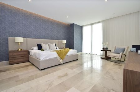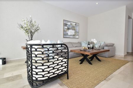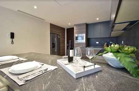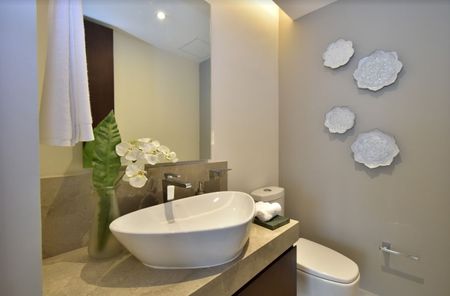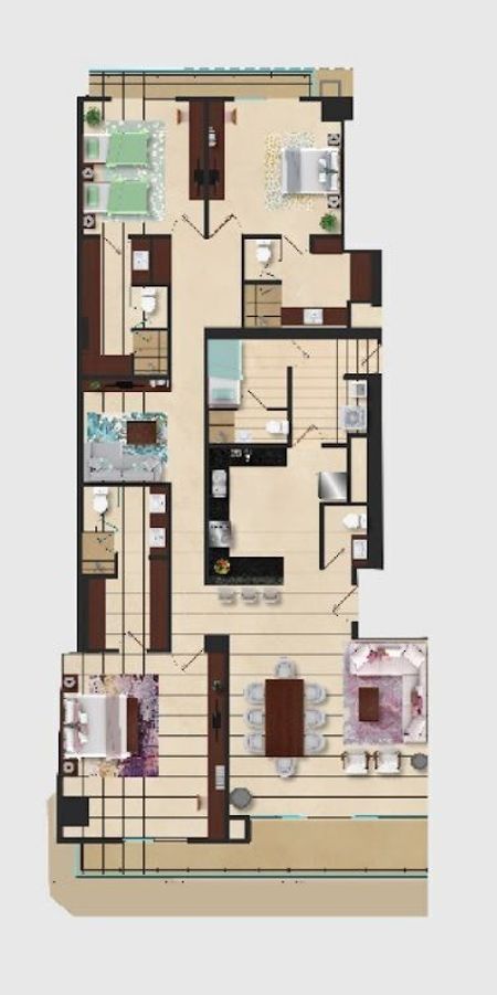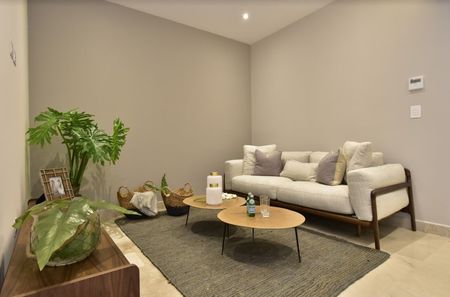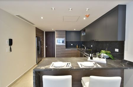 Este departamento se ubica en el nivel 1, cuenta con cocina con barra, cuarto de servicio con baño, área de lavado, medio baño de visitas, sala - comedor, sala de tv y 3 recámaras, todas con vestidor, baño completo y acceso a terraza.