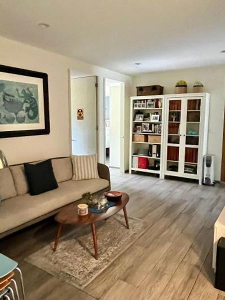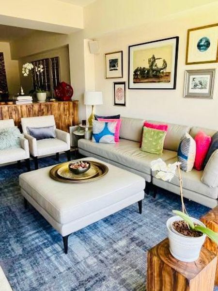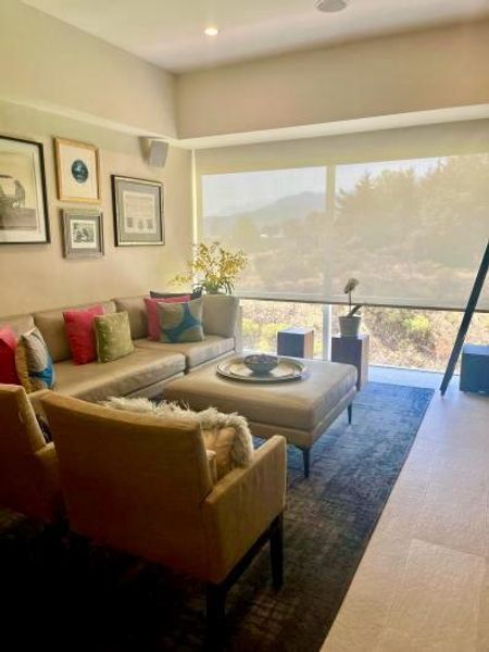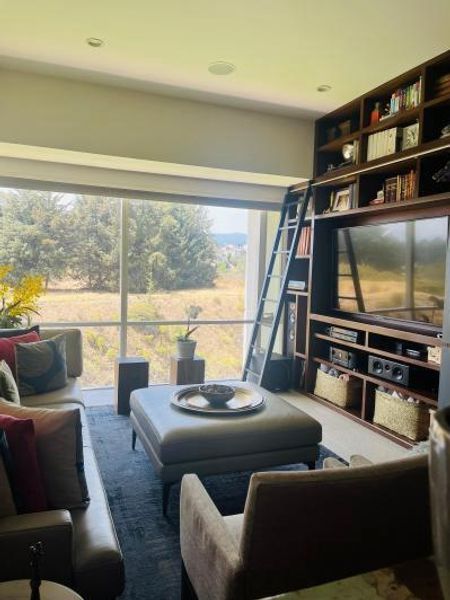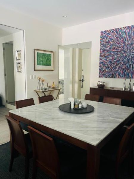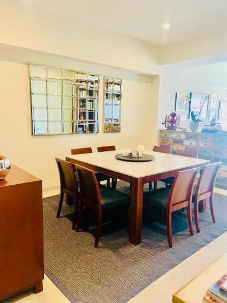 Amplia y muy iluminada sala comedor con vista arbolada.