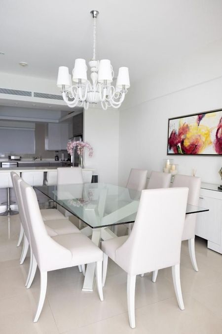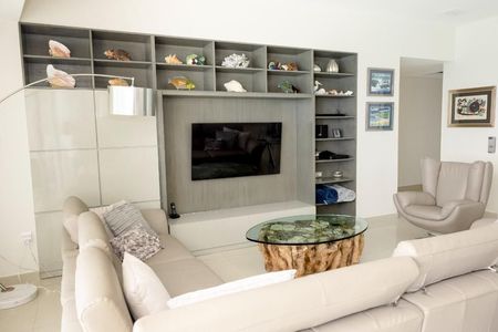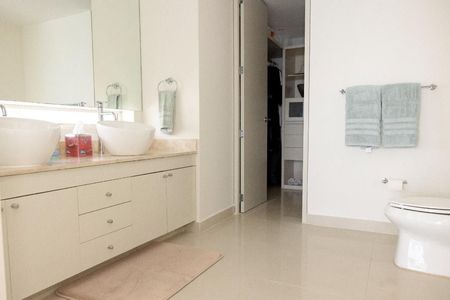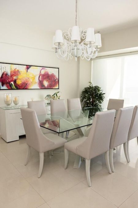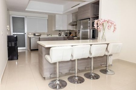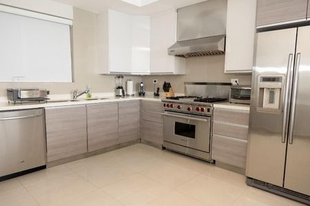 El departamento tiene 3 recamaras, 3 baños completos, sala, comedor, cocina equipada con barra, cuarto de servicio con baño que funciona también como una cuarta recamara, área de lavado, terraza con jacuzzi.