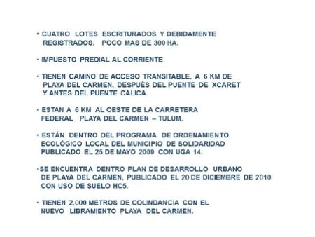 En venta 4 terrenos divididos en 4 fracciones de 75 hectáreas cada una, ubicadas cerca de Playa del Carmen, por lo que se pueden vender una, dos, tres o todas. Son 300 hectáreas aproximadamente por los 4, están escrituradas, registradas en catastro y RPPC.