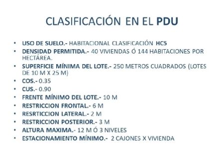 La densidad por hectárea permitida es de 40 viviendas o 144 habitaciones, la altura máxima permitida es de 3 niveles o 12 metros, COS de 0.35 y CUS de 0.90.